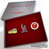 The pin badge set comes housed in a luxurious display box which includes a foam insert with a deep red velour topcoat. The box lid features an embossed metallic red foil-stamped graphic.